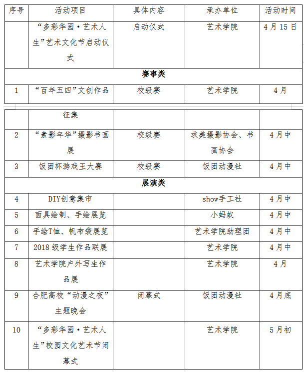 二、活動時間 2019年4月 活動承辦:藝術學院團總支 活動協(xié)辦:藝術學院學生會、藝術學院助理團、手工社、小螞蟻協(xié)會、書畫協(xié)會、攝影協(xié)會、論智桌游社、排球社、動漫飯團社。 (一)4月18日中午12:00(如遇天氣原因將調整日期)于翰林廣場啟動“活動主題·藝術人生”校園文化藝術節(jié)啟動儀式。二級學院由行政副院長領隊,組織團總支書記,各級各類學生組織骨干代表、學生代表5人參與啟動儀式;校級學生組織由校團委統(tǒng)一組織。各單位提前20分鐘到達廣場,按照指定位置列隊,著裝要求以簡單大方為主,佩戴團徽。 (二)各學院、各組織鼓勵并動員學生參與“多彩華園·藝術人生”文化節(jié)系列活動,通過文化藝術節(jié)系列活動培養(yǎng)學生藝術審美,豐富學生的藝術生活。活動具體安排如下: (一) 關注微信公眾號“安徽新華學院團委”,點擊菜單欄“PU口袋校園”注冊并登陸,首頁找到活動,點擊“報名”,參與活動。 (一)校園文化月活動作為高校校園文化內涵的一種外在表現(xiàn)形式,是展示學院師生良好精神風貌的重要窗口,對于進一步激發(fā)廣大師生工作學習的積極性和主動性,對于創(chuàng)造和諧、求知、進步的育人環(huán)境,具有十分重要的意義。 (二)藝術學院團總支、學生會要發(fā)揮骨干作用,強化措施,組織得力,注重實效。在開展活動時要注意調動學生的積極性、創(chuàng)造性,增強活動的實效性,擴大學生的參與面,爭取使每位同學都參加一項活動,把本次文化月辦成學生參與面廣、活動多、質量高的一屆盛會,讓學生真正在活動中施其所長,發(fā)展個性,使青年學生在活動中得到教育和熏陶,不斷擴大校園主流文化的影響力。 (三)各項活動要圍繞“多彩華園·藝術人生”的主題,抓住有利契機,圍繞學生成長、成才精心設計,認真組織落實,力求精品。所有參展作品應適合當代大學生的基本特征,體現(xiàn)當代青春風采。參賽所需用品自備。 (四)各二級學院積極鼓勵并動員學生參與“多彩華園·藝術人生”文化節(jié)系列活動,立足文明校園建設,引導學生向上生活,躍動青春。各社團結合主題開展活動,活動結束將于閉幕式進行相關獲獎表彰。